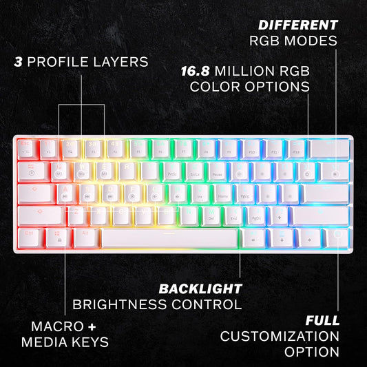 60% Mechanical Keyboard Wired Dual-mode Keyboard 61-Key RGB Rainbow LED Backlit USB Type-C Waterproof Gaming Keyboard Anti-ghosting Keys for Gamers and Typists(White/Red Switch) Wired